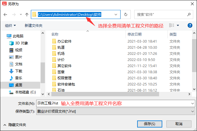 2.在弹出的提示窗口选择“是”,接下来选择全费用综合单价工程文件的存储位置,并填写工程名称,如图示: