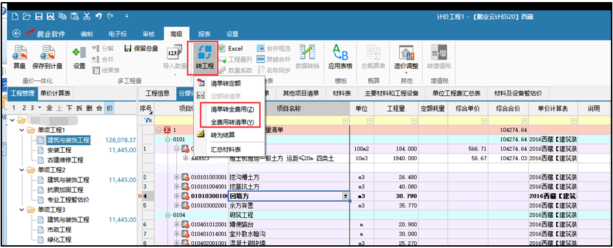二、新增“高级——转工程——清单转全费用、全费用转清单”功能。