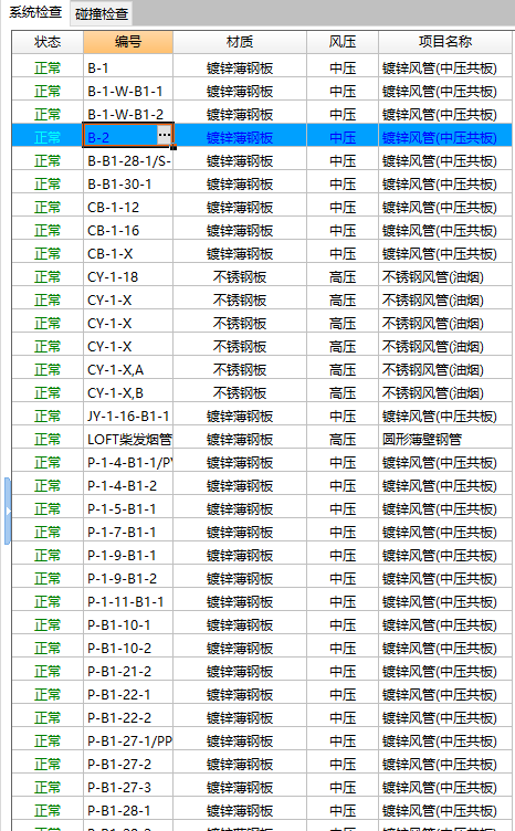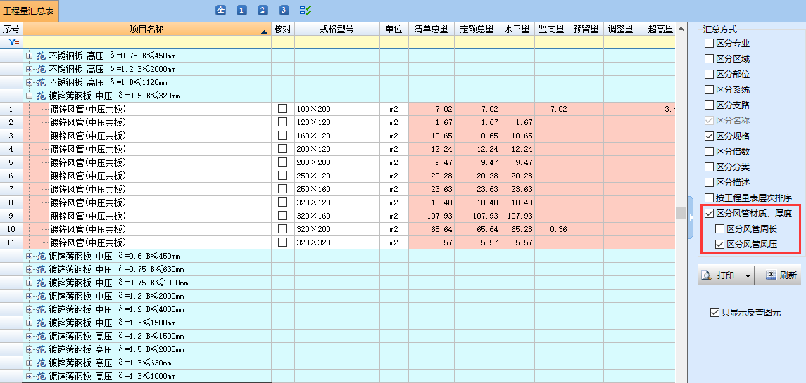 汇总表中按照各系统所设置的风管材质、风压等级、大边长进行厚度的确认及工程量的汇总