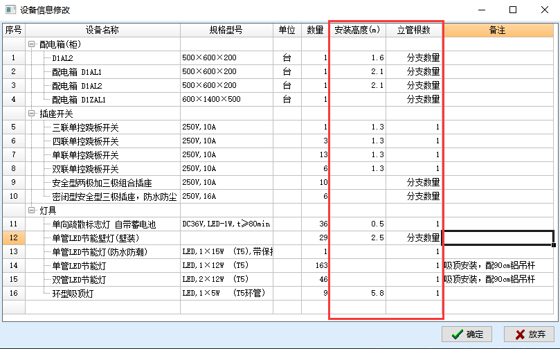 设备表可以对设备安装高度和立管根数快速修改