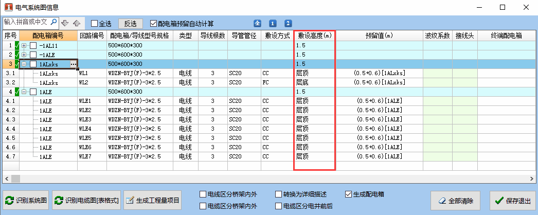 4.电气系统表增加敷设高度