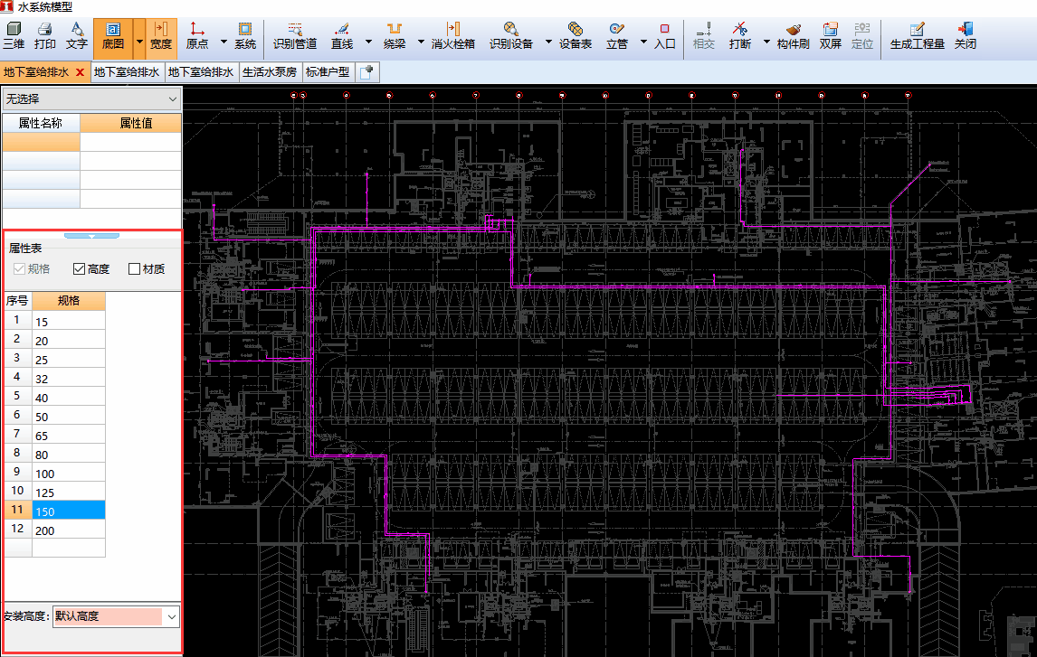 管道属性“高差”调整为 “安装高度”,减少用户在设置管道高度时的换算过程,安装高度支持默认高度、层顶等输入方式