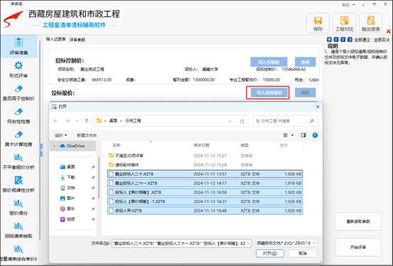 点击“导入投标报价”可以对投标数据文件进行导入,如果投标文件在同一个目录还可以全部选中一次性导入。如图示: