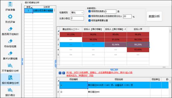6. 在“报价规律性分析”界面,将会对清单单价规律性、清单组价规律性、材机规律性等进行数据分析,如图示: