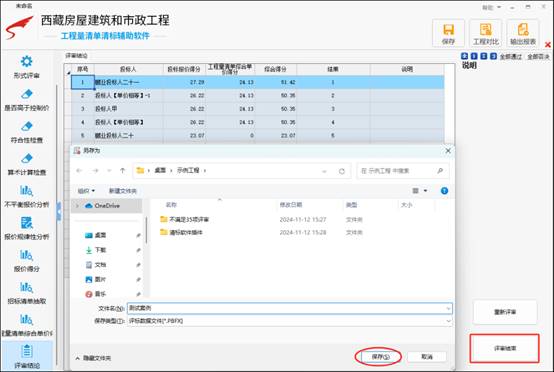 8. 按照评标流程进行操作,在评审结束后对评审的工程数据进行保存,方便下次打开查看。如图示:
